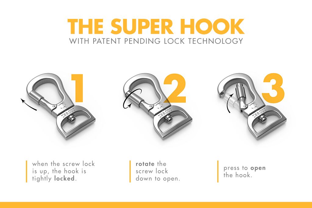 Smycz wyposażona została w specjalnie opatentowany przez markę Zee Dog karabińczyk Super Hook (rozmiar S oraz L) -obraca się, o 360 stopni idealnie łączy się z obrożami. Eliminuje problem związany z samoczynnie odpinającą się smyczą, niewygodnymi karabińczykami, czy zabezpieczeniami, które nie spełniają naszych oczekiwań.