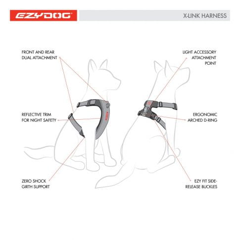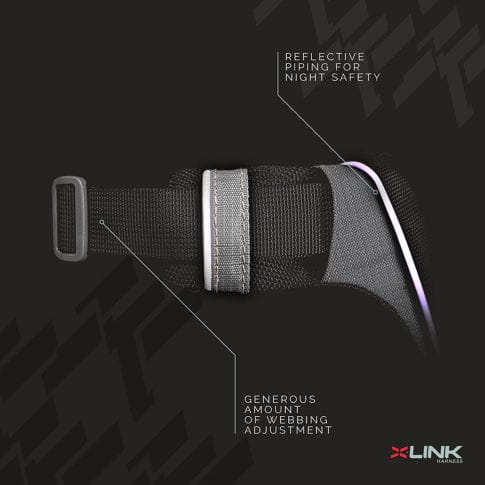 X-Link to uprząż dla psa z dwoma punktami mocowania smyczy umieszczonymi zarówno z przodu, jak i z tyłu. Przednie oczko jest najlepszy do szkolenia psów i uczenia psa, aby nie ciągnął na smyczy, podczas gdy tylny D-ring pozwala używać X-Link jako standardowej uprzęży do spacerów, wycieczek czy też amatorsko uprawiania psich sportów.