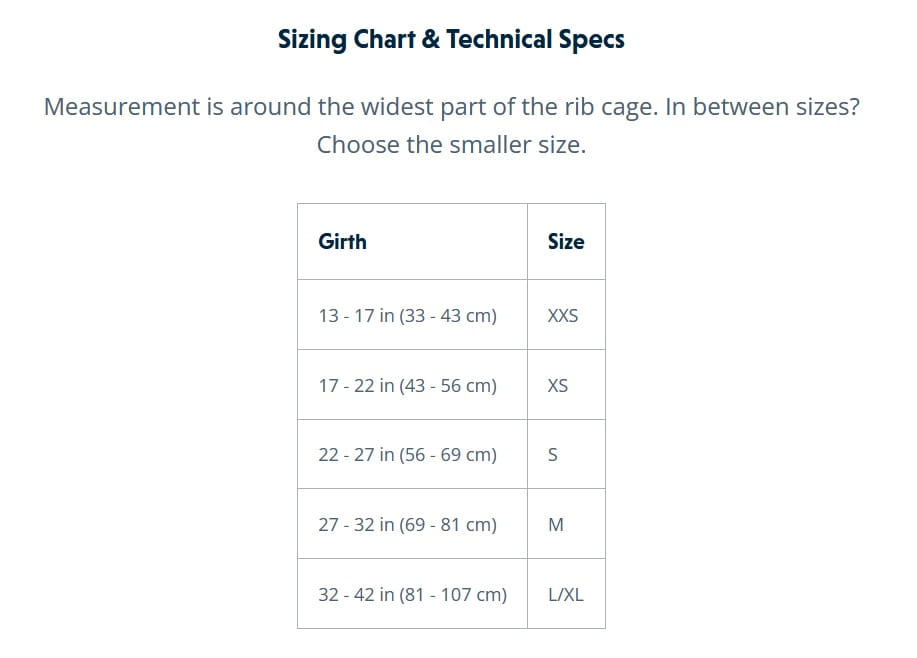 Tabela rozmiarów dla szelek Load-UP. Zmierz obwód klatki piersiowej psa i na tej podstawie wybierz rozmiar.